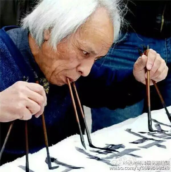 只见这位仁兄一手抓过四五支毛笔,蘸上墨就往宣纸上招呼……