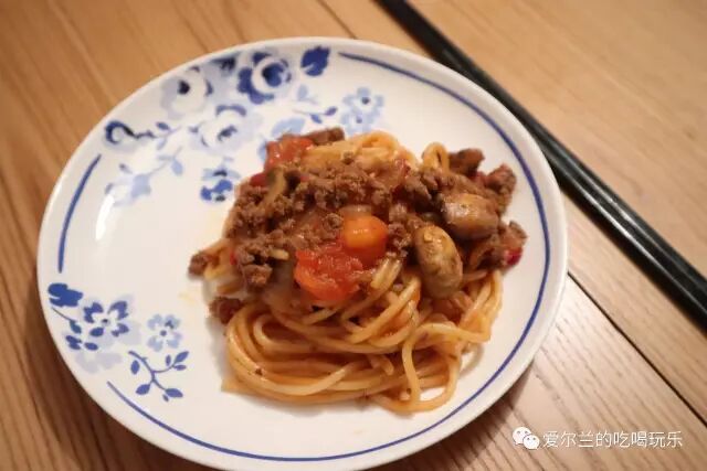 同时另起锅炒制酱汁,洋葱切碎,蘑菇切片,油热后加入。炒香后,加入肉末和切碎的番茄,同时加入超市都可以买到的番茄酱,再加入一杯水,沸腾后加入煮好的意面,收汁后就可盛出