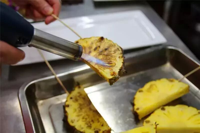 用喷枪高温将表面含糖量高的菠萝汁烧出焦糖即可!