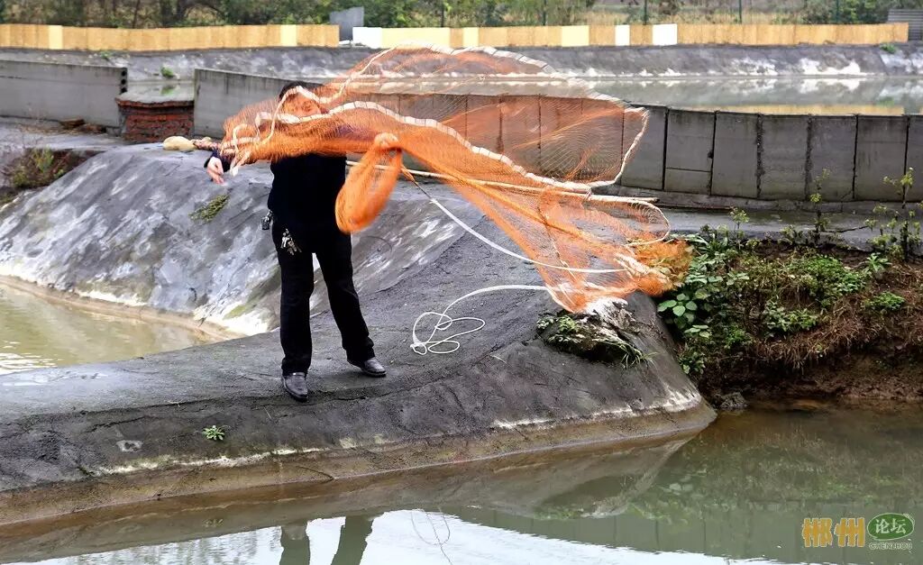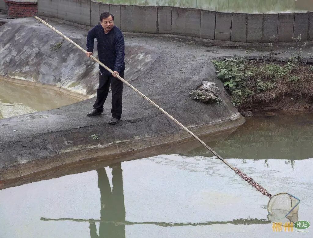 工作人员给养殖一年的娃娃鱼捞水上漂浮的垃圾