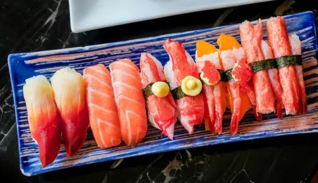 基本款的手握寿司们也非常出彩,北极贝寿司、三文鱼腩寿司、香芒美人鱼,用料非常充足,厚厚的熊抱着精腌的寿司饭,一口一极乐!