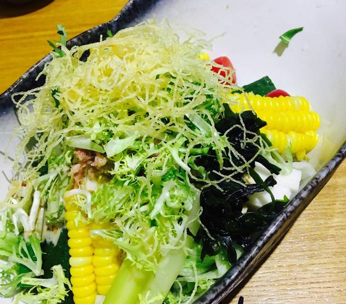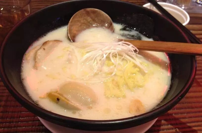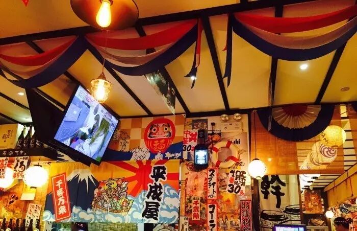 这也是一家非常“日本”的居酒屋。这里最有名的食物是幸福拉面——满满的一大碗幸福感,原来幸福的意思就是大口吃肉哈哈(因为浇头非常多啊,有鸡块、鸡翅膀、烤肠、青椒串儿、叉烧、海苔、笋片……)。