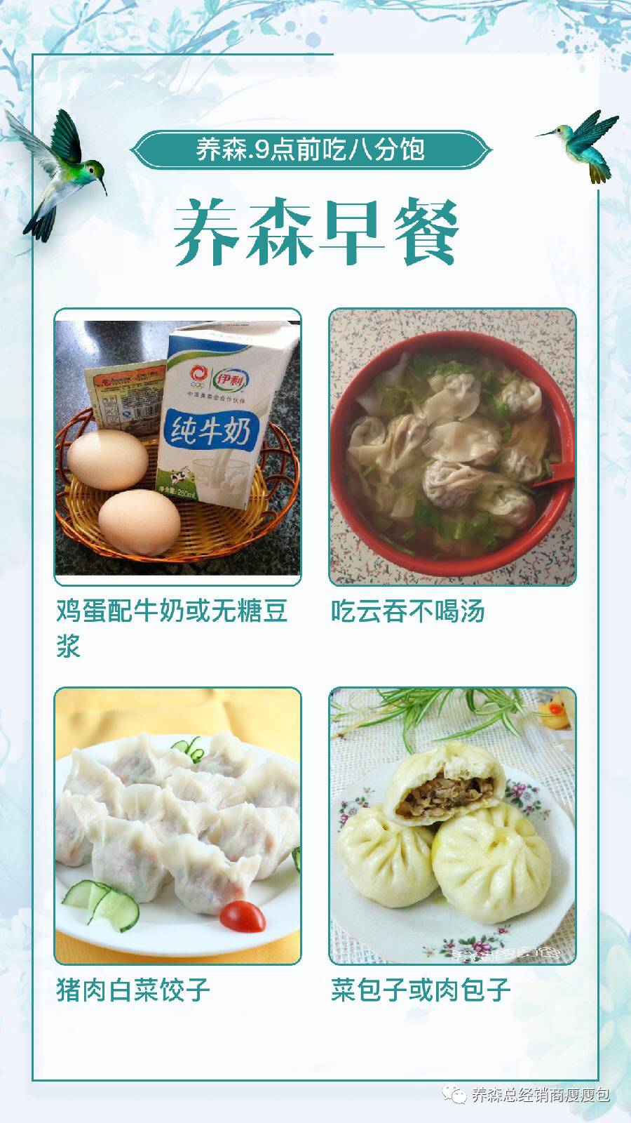 早餐可以吃:(稀饭,麦片,牛奶)必须配鸡蛋,如果不喝稀的就宽松了:馒头,包子,馅饼,汉堡,披萨,面条,水饺(面条,水饺吃干的不喝汤),面包(全买的,不要带陷的,带馅的热量高)等,吃这些的时候,不要喝水,饭后一小时可以喝水,白天不渴不喝水,喝水的话就像品茶一样,小口小口喝。