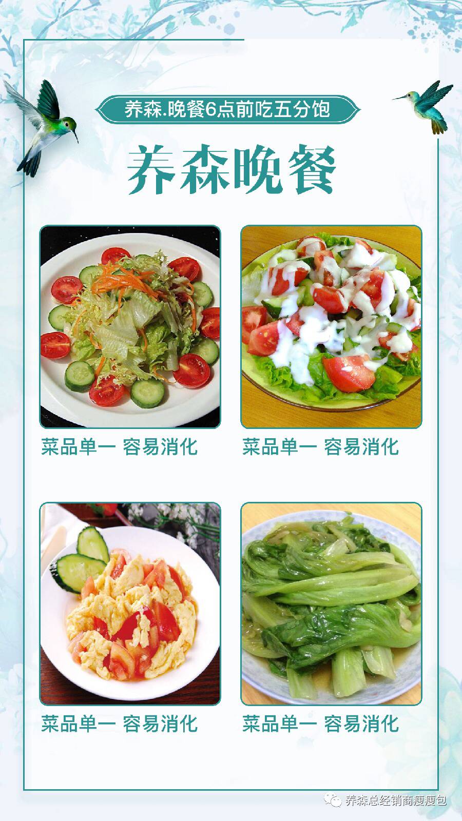 晚餐:主食加蔬菜,晚饭吃的单一些,也是养生的,晚饭在6点左右吃完,7点以后就开始不进食和喝水了,因为我们身体7点后就不工作,不消耗我们吃进去的能量,这时候就会转化为脂肪了。