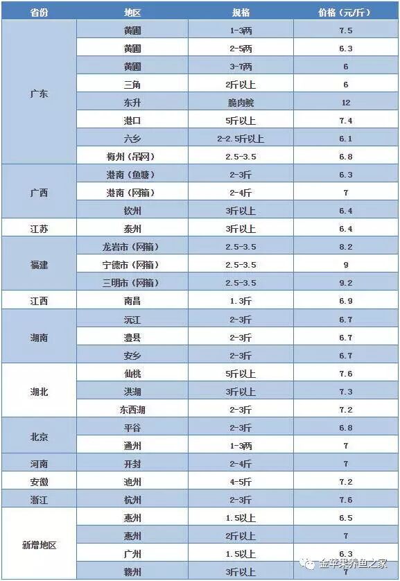 新增部分地区报价如下:广东惠州1.5斤以上6.5元/斤,2斤以上7元/斤,广州1.5斤以上6.3元/斤;江西赣州草鱼报价,3斤以上规格目前7元/斤。