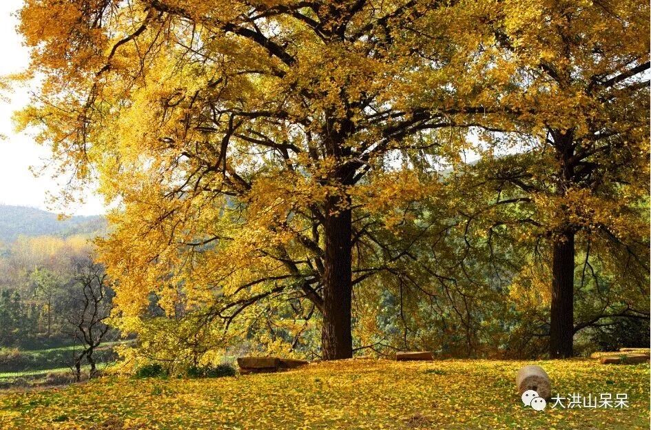 金黄色的银杏树,褐黄色的栎树,青绿色的松树,