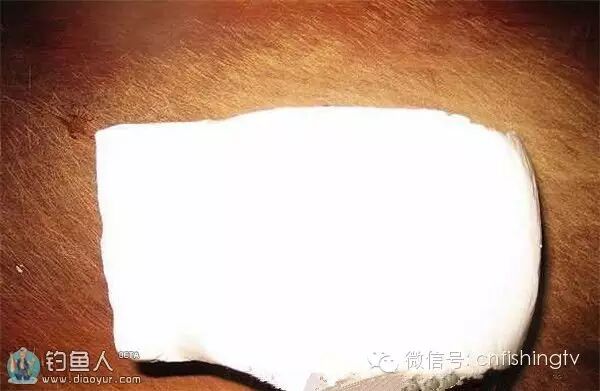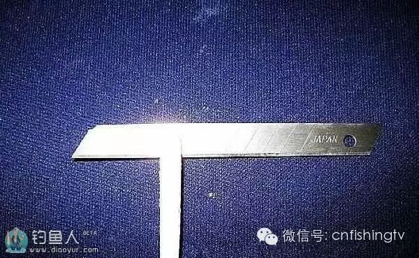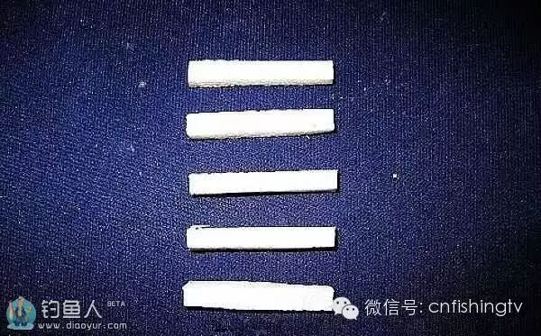 1-5、参看一下自制的漂,漂在线上可以任意滑动,便于上大鱼后收放自如。用一块轻质硬泡沫用刀切成2.5*2.5*30大小。