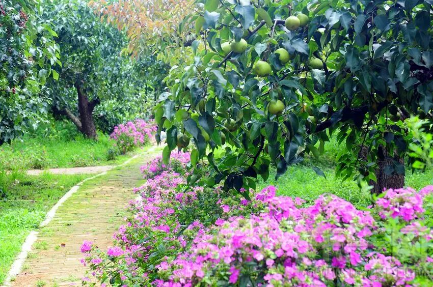 穿过回廊,就可以体验“小桥流水人家,观鱼摘果赏花”的田园之乐。诱人的果香,沁人心脾。沿着林间小路,一直走到神清气爽。