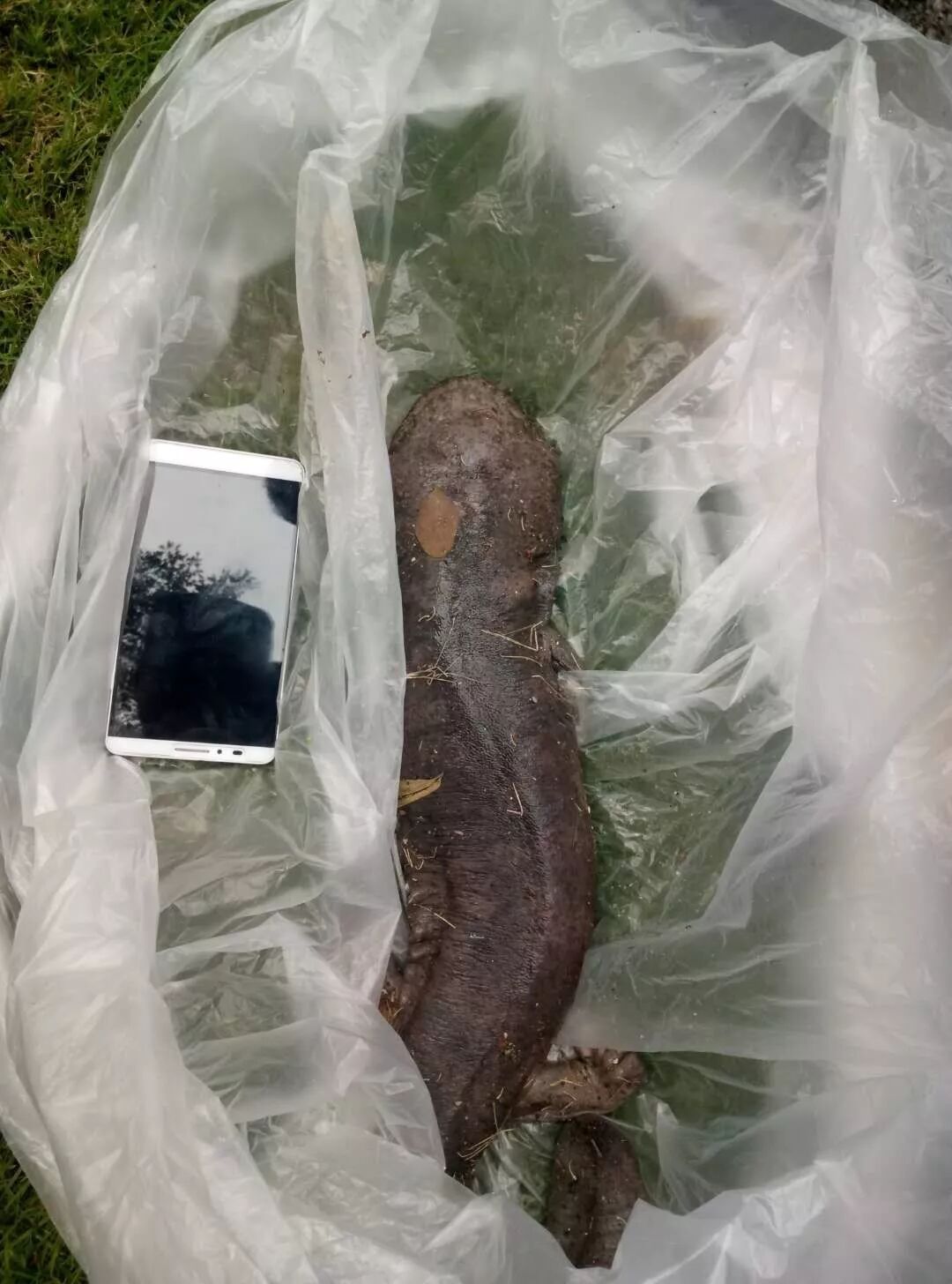 “哇!这是什么?咋一瞧像鲶鱼,后发现长了四条腿,又不像。”10月13日上午,如山湖城家政员工例行在凤栖三山六街清运垃圾,有了意外发现!“吓我一跳,长了四只脚的鱼还真从没见过。当即报告给我们的物业管家,经管家现场查看,竟然发现是国家二级保护动物娃娃鱼。”管家第一时间拨打了110报警,将娃娃鱼保护起来。