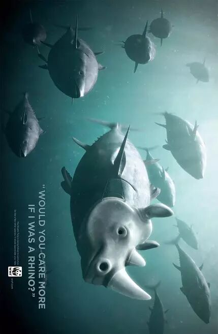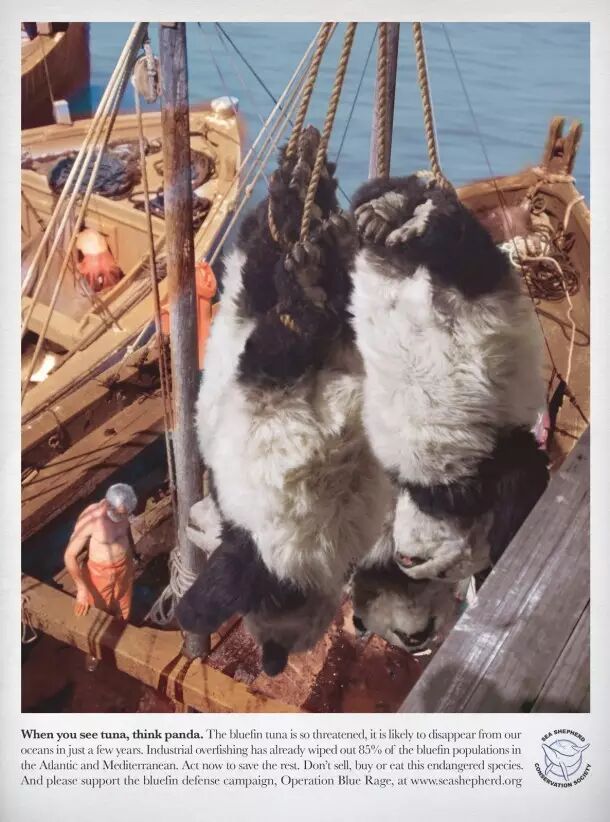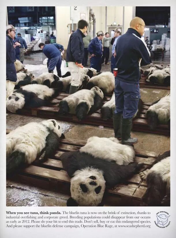 美国民间组织Ocean Shepherd呼吁人们保护蓝鳍金枪鱼,他们做了一套非常经典的海报:“假若你看到的是熊猫,而不是蓝鳍金枪鱼呢?”