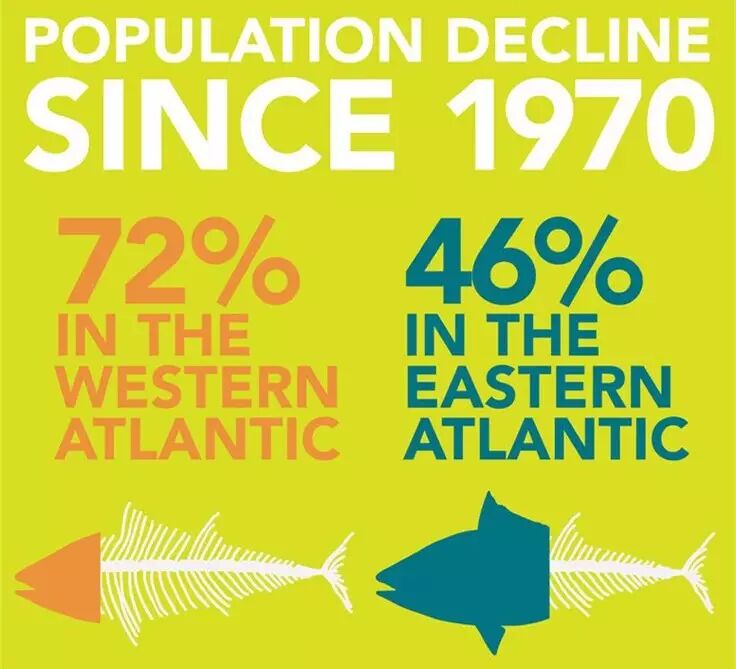世界上其它地方的金枪鱼有80%会被出口到日本,日本和其它亚洲市场的巨大需求推动了对蓝鳍金枪鱼的捕捞,并且,越来越多的幼鱼被捕。而大西洋蓝鳍金枪鱼的处境比太平洋蓝鳍金枪鱼的处境要糟得多。据估计,这种处于生态危机中的大西洋金枪鱼在北美的种群数量只剩下9000条左右。