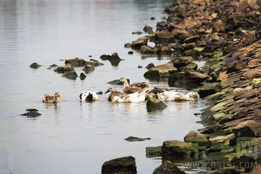 一群鸭子在玩耍,石头上的小田螺是它们的目标。吃归吃,不要把蛋下在这里哇。