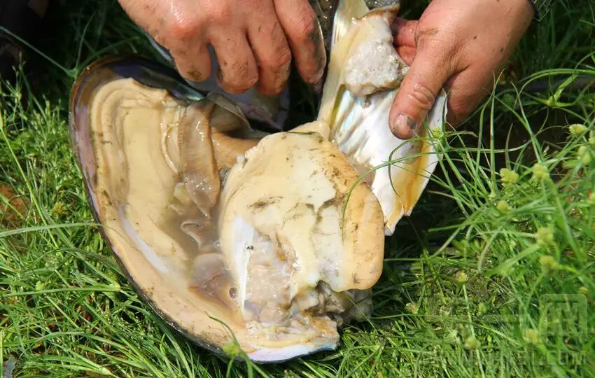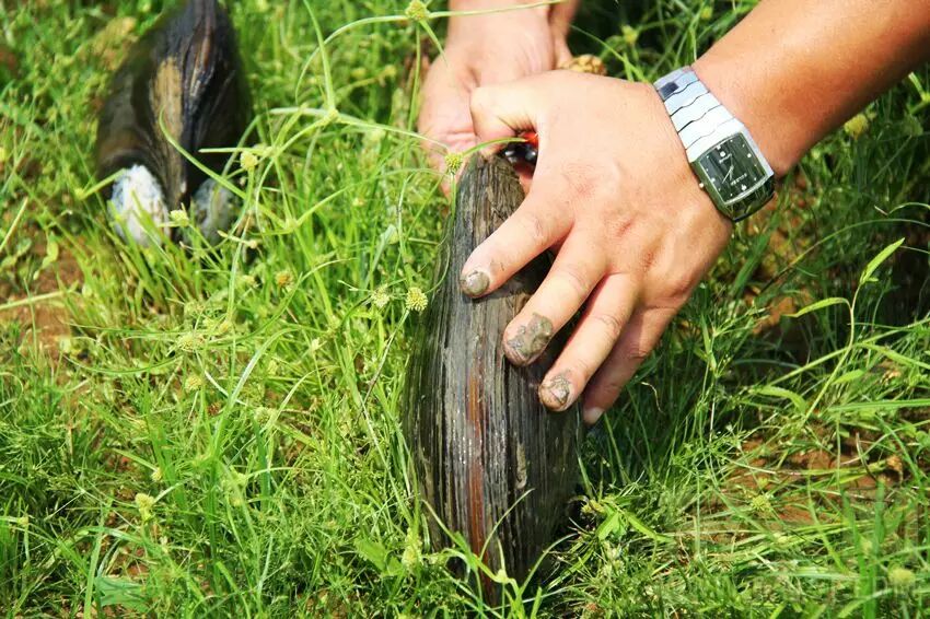 一只大河蚌,俗名“骚嘎子”。想抓河蚌太容易啦,先用脚踩准它的位置,然后两手抓住河蚌用力一抠,就出来了。