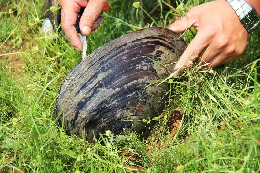 刚抓的河蚌,双壳紧闭,有装死的意思。所以,车钥匙就成了剖开河蚌的利器。