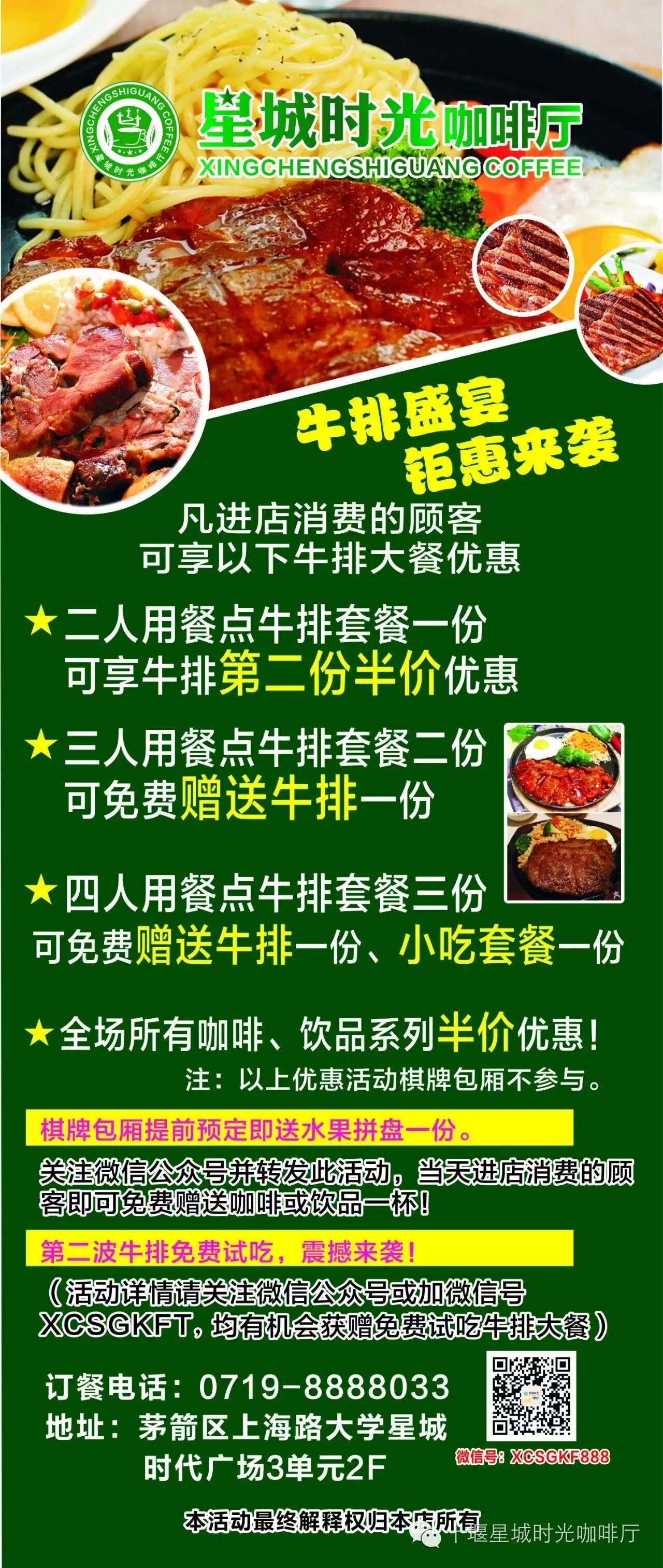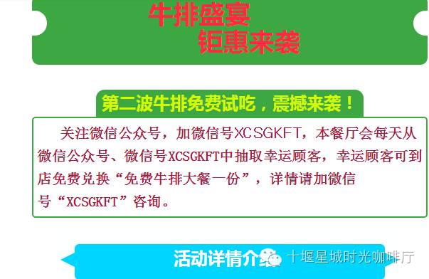 关注微信公众号,加微信号XCSGKFT,本餐厅会每天从微信公众号、微信号XCSGKFT中抽取幸运顾客,幸运顾客可到店免费兑换“免费牛排大餐一份”,详情请加微信号“XCSGKFT”咨询。