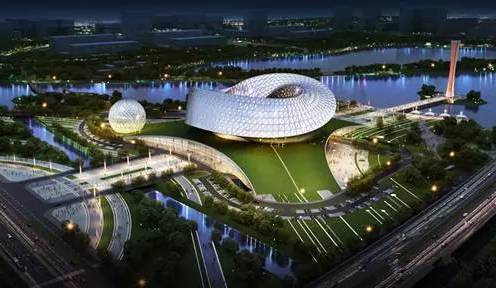 河南省科技馆新馆位于郑州市郑东新区白沙园区象湖湖畔