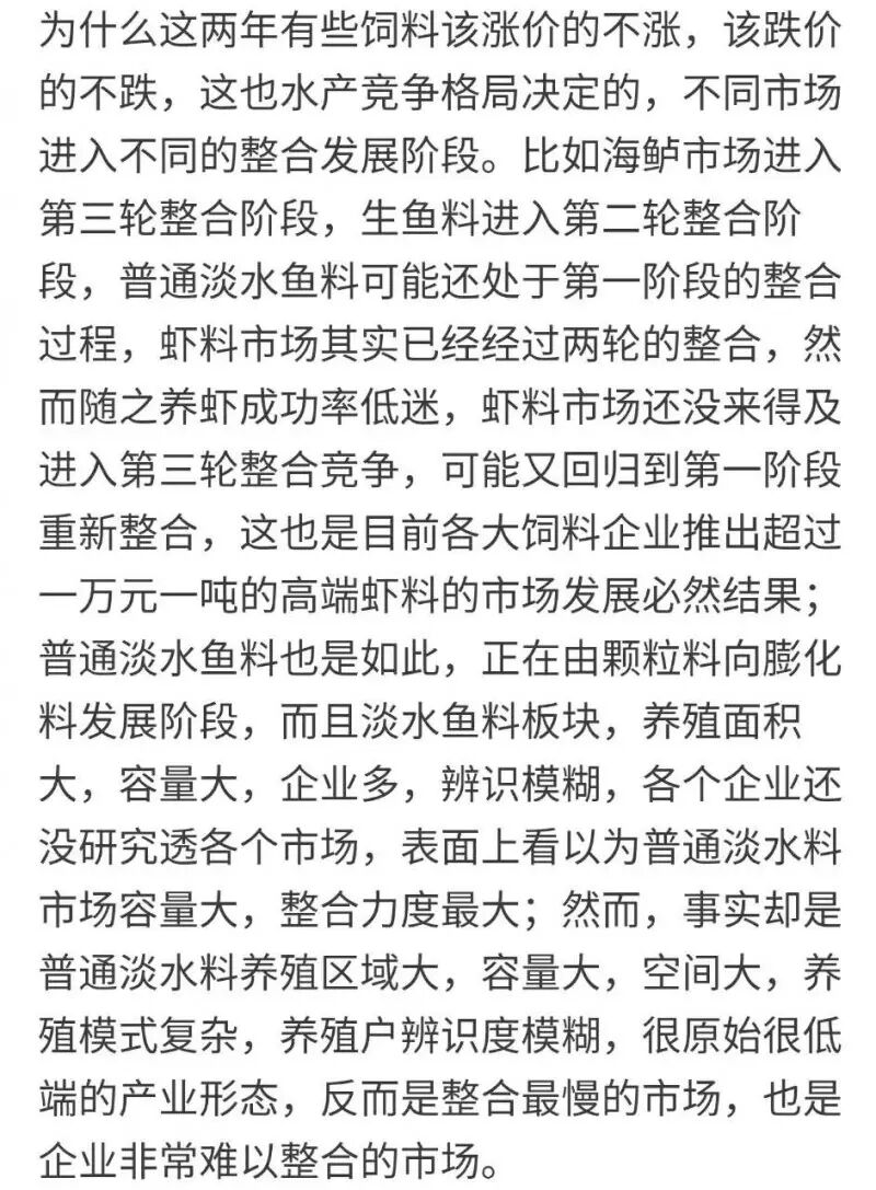 从不同品种饲料的一涨一跌中,我们看到了不同品种不同市场之间的竞争正呈现出分化。特别是从原料和饲料价格的波动对比,折射出这两年特种水产料市场竞争进入一种非常规竞争阶段,本质上是行业发展到某一阶段的一种整合。