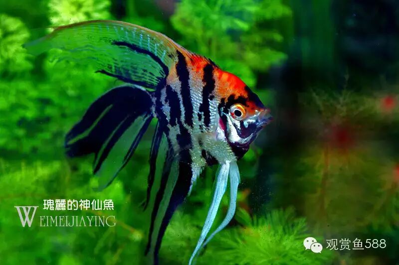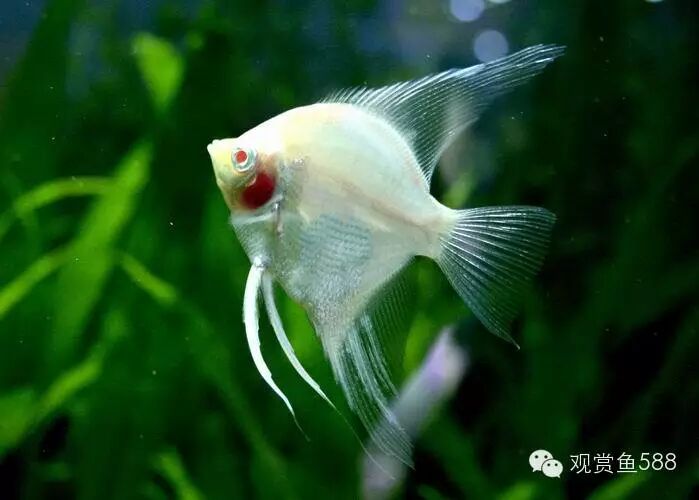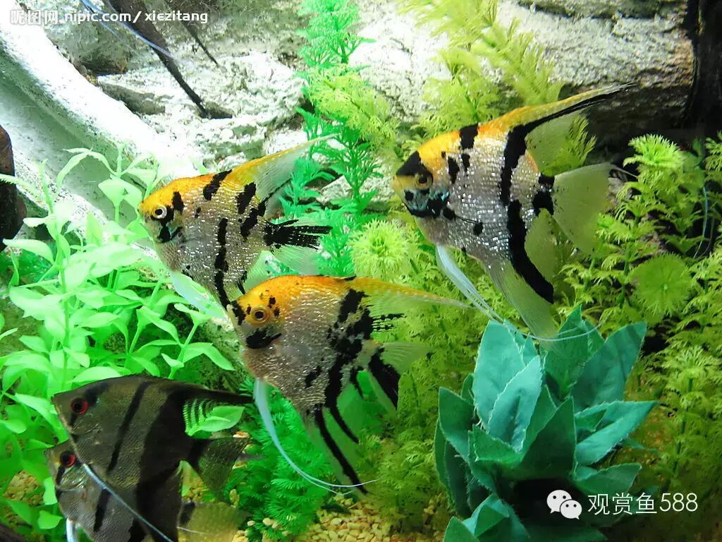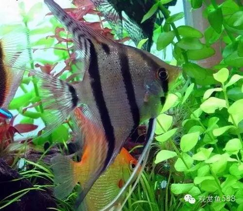 六、神仙鱼 神仙鱼体态高雅、游姿优美,虽然它没有艳丽的色彩,但是,受水族爱好者欢迎的程度是任何一种热带鱼无可比拟的,似乎还没有发现一个饲养热带鱼多年的爱好者没有饲养过神仙鱼的事例,神仙鱼几乎就是热带鱼的代名词,只要一提起热带鱼,人们往往第一联想就是这种在水草丛中悠然穿梭,美丽得清尘脱俗的鱼类。神仙鱼鱼体侧扁呈菱形,宛如在水中飞翔的燕子,故在中国北方地区又被称为“燕鱼”。