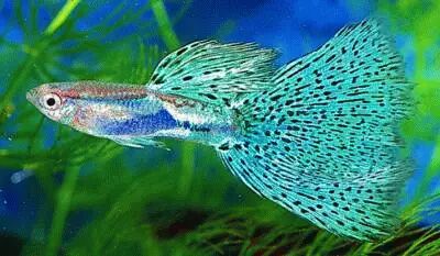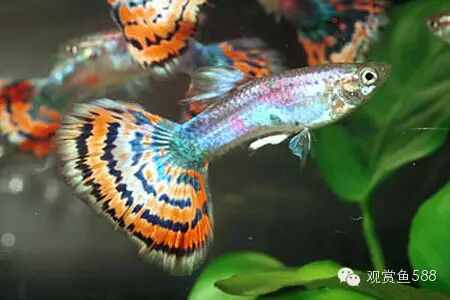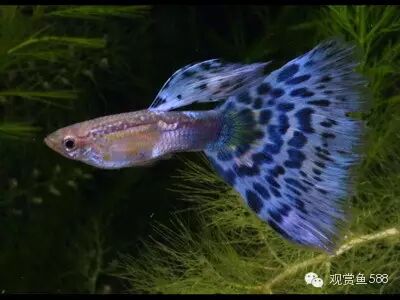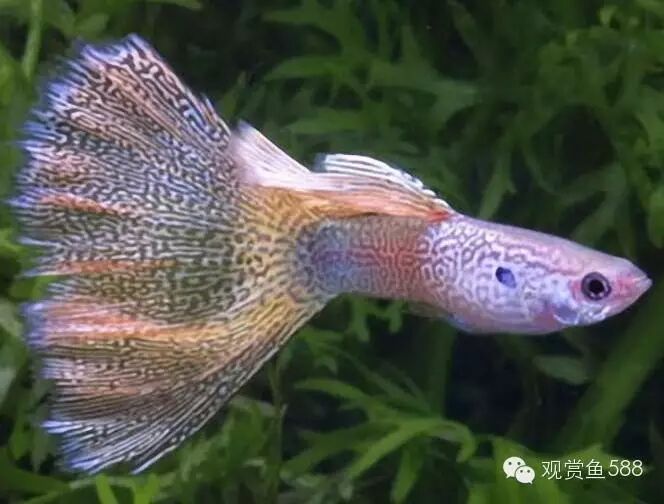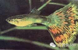 十二、孔雀鱼 孔雀鱼体长4~5厘米,是最容易饲养的一种热带淡水鱼。它丰富的色彩、多姿的形状和旺盛的繁殖力,倍受热带淡水鱼饲养族的青睐。尤其是繁殖的后代,会有很多与其亲鱼色彩、形状不同的鱼种产生。雌、雄鱼差别明显,雄鱼的大小只有雌鱼的一半左右,雄鱼体色丰富多彩,尾部形状千姿百态。