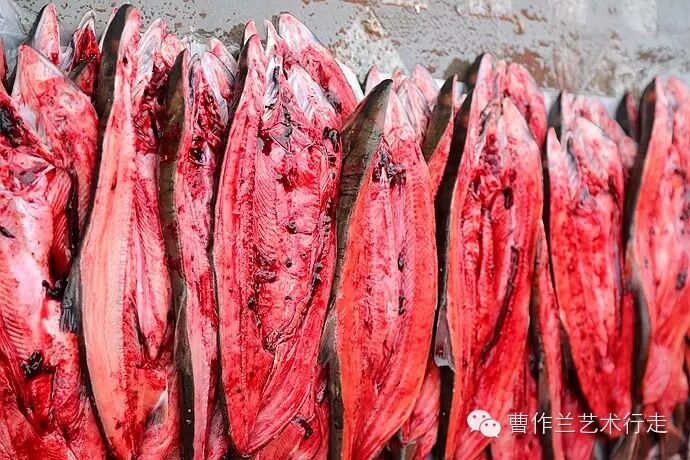 这是刚刚分割的大马哈鱼,血液鲜红鲜红的。