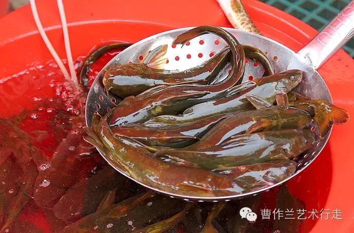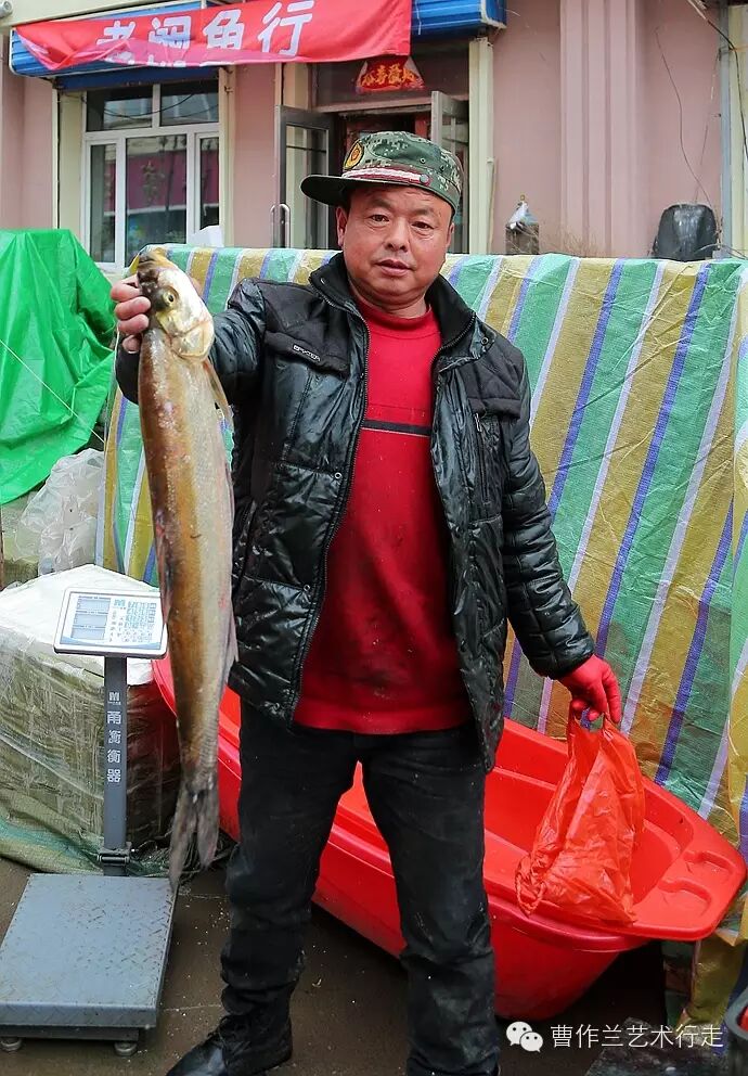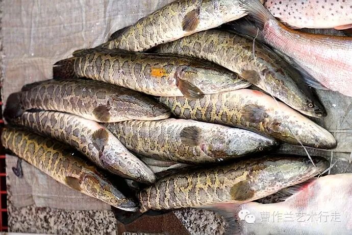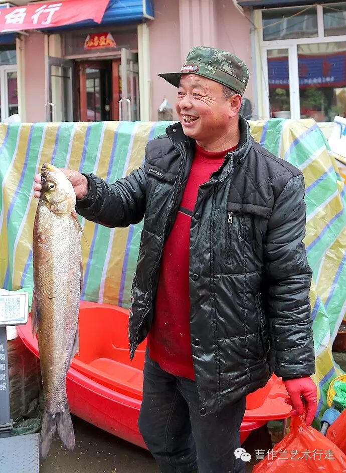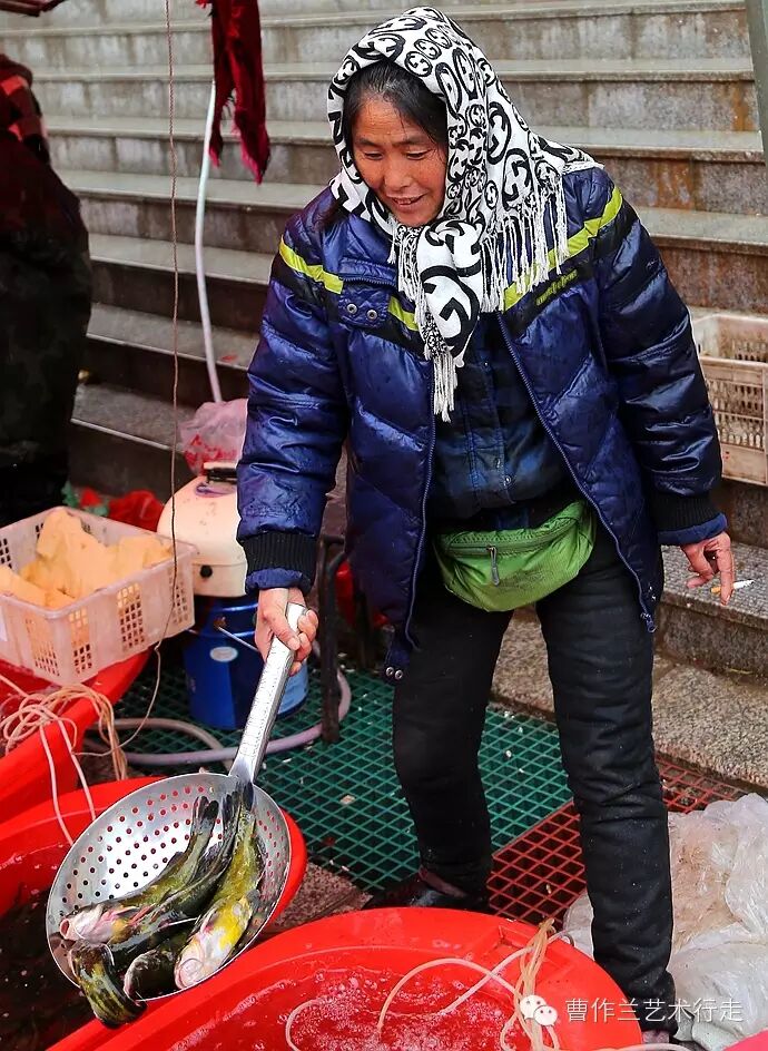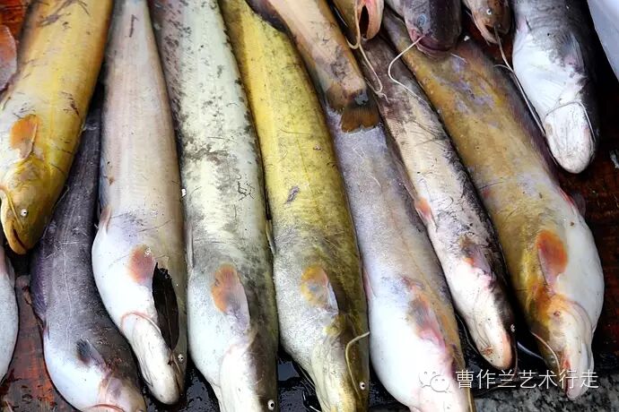 热情的卖鱼大嫂拿起特号大笊篱,把鱼捞起来让我们拍照。