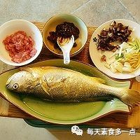 1. 黄鱼去鳞洗净沥干,背部划花刀。加1勺料酒,少量盐抹匀鱼身腌制20分钟。腌好的鱼滤去血水,用厨房纸擦干表面,拍适量干淀粉。肉末加半勺料酒腌制10分钟。姜切丝,蒜拍碎,葱切碎,水发香菇切碎。豆瓣酱,辣豆豉备用。