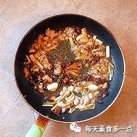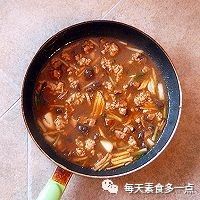 3. 剩下油锅入姜丝,蒜瓣,葱白爆香。入肉末炒散,入香菇碎炒香。加入豆瓣酱和辣豆豉炒匀。