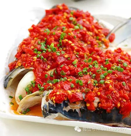 做法:1)鱼头洗净后,从鱼身的部位下刀,对半切成鱼皮相连的两部分,用厨房纸巾擦干鱼头内外表面的水;2)撒少许盐和料酒,均匀涂抹在鱼头的内外表面;3)放入切好的葱段和姜片,腌制10分钟;4)锅中加入植物油,烧热后放入葱段和姜片;5)炸出香味后,将葱油滤出待用;6)捞出葱段和姜片,铺在盘中;7)将腌好的鱼头,鱼皮朝上放入盘中,均匀铺上一层剁椒,放入已经上汽的蒸锅,大火蒸10分钟左右;8)将蒸好的鱼头取出,沥掉盘中多余水分,烧热葱油,趁热浇上;9)再淋上少许香油;10)最后撒上葱花就可以了。红绿搭配甚是扎眼呐。