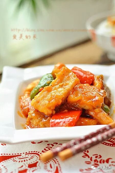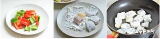 青椒红椒也切成大小相近的方形。腌好的鱼块放在生粉沾一层生粉。不粘锅中倒少许油,油6成热时将裹好生粉的鱼块放入。