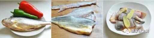 准备好材料,黄鱼去鳞后洗净控干,青椒红椒洗净。去除鱼头的黄鱼横向片开,剔除鱼骨。 将剔除鱼骨的鱼肉切成大小相同的块状,加盐,料酒,胡椒粉和姜片拌匀腌15分钟。