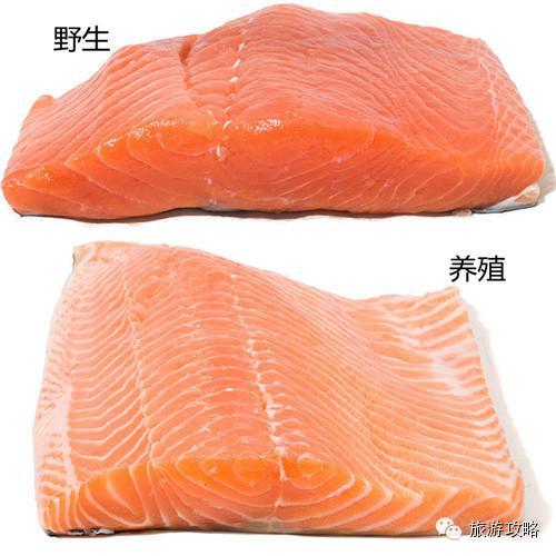 养殖的三文鱼肉质肥硕,鱼肉呈浅桔红色,中间分布均匀的白色脂肪条纹。相比野生三文鱼肉更红,几乎看不到脂肪条纹。
