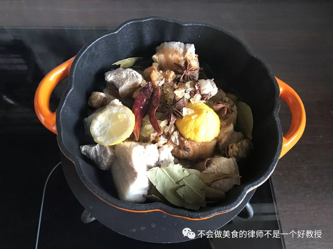 3、 顺序将沥干后的五花肉放入铸铁锅内,同时放入各种调料,倒入料酒、老抽,铺上碎黄冰糖。