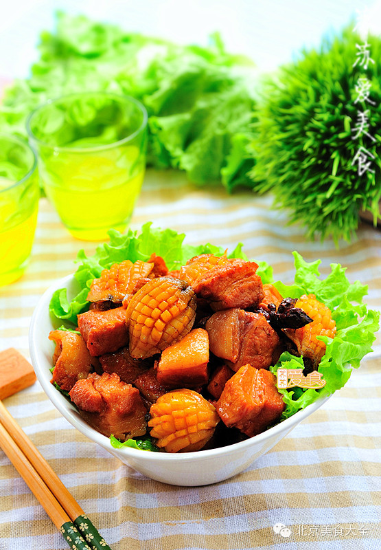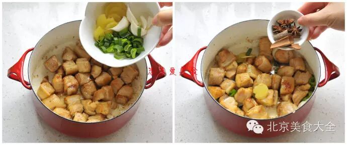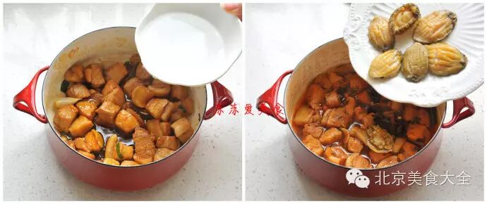 材料:五花肉500克、鲍鱼6个、葱姜适量、八角2个、桂皮1小根、料酒1大勺、禾然素食酱2大勺、腐乳汁 2大勺、禾然有机酱油2大勺、冰糖20克、蚝油1大勺
