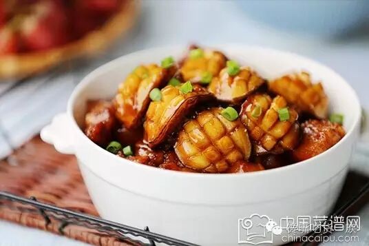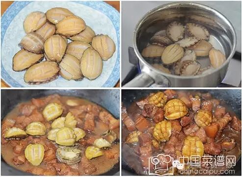 12、五花肉烧至八成熟的时候,放入鲍鱼,改中小火再焖15分钟