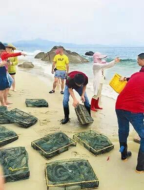从当事人拍摄的照片中,深晚记者看到,沙滩上放着十多笼鱼,大部分鱼像蛇一样,嘴部比较尖,身上有花纹。旁边,七八名男女围着这些鱼,一名男子正在搬一个笼子。另一张照片中,三名男子拉着一个黑网站在海水中。冯女士说,他们把笼中的鱼放到了网中,再把网拖进浅水区,将鱼放生。“还有一部分是用快艇运到远处的海里放生的。”冯女士说。