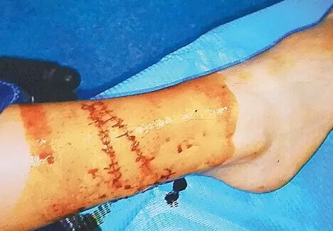 陈先生抱着孩子跑到沙滩上,低头一看孩子的腿脚,不由得倒吸了一口凉气——小熙的小腿和脚上有数条很深的伤口,血正不断往外流,小腿后方伤口处,皮肉已经绽开外翻。小熙的妈妈已经吓得慌了手脚,闻声围过来的人赶忙用毛巾包住孩子的伤口,并找来消毒水。不久,小熙被送往附近的梅沙医院。医生在简单处理后,建议将小熙转送至上级医院治疗。当晚,小熙在南山区人民医院接受了一个多小时的手术,医生对他的伤口进行了缝合处理。