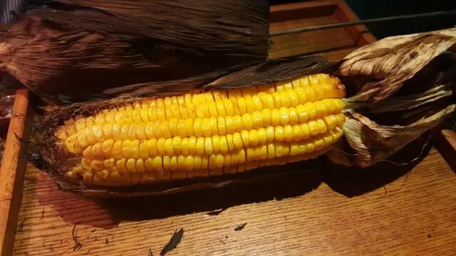 一大穗玉米整个带着皮烤,扒开之后金黄的玉米粒让人喜欢得不得了。牛奶玉米特别甜,一咬有股水,而且吊炉烤让玉米一点都不硬,还有烤过的焦香和软韧,真的吃了一穗想另一穗啊。