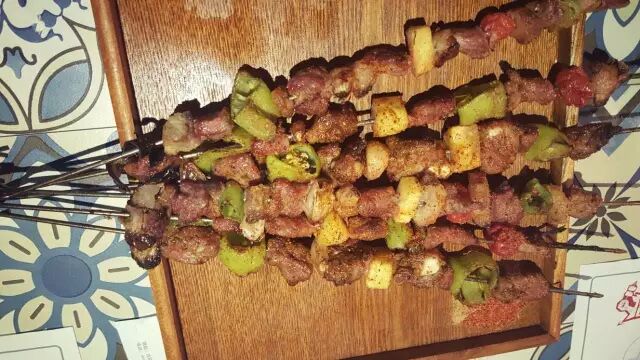 半个胳膊长的大串老过瘾了,除了肉块还有菠萝块、青椒、小柿子,荤素搭配。肉很入味,微辣,外焦里嫩。