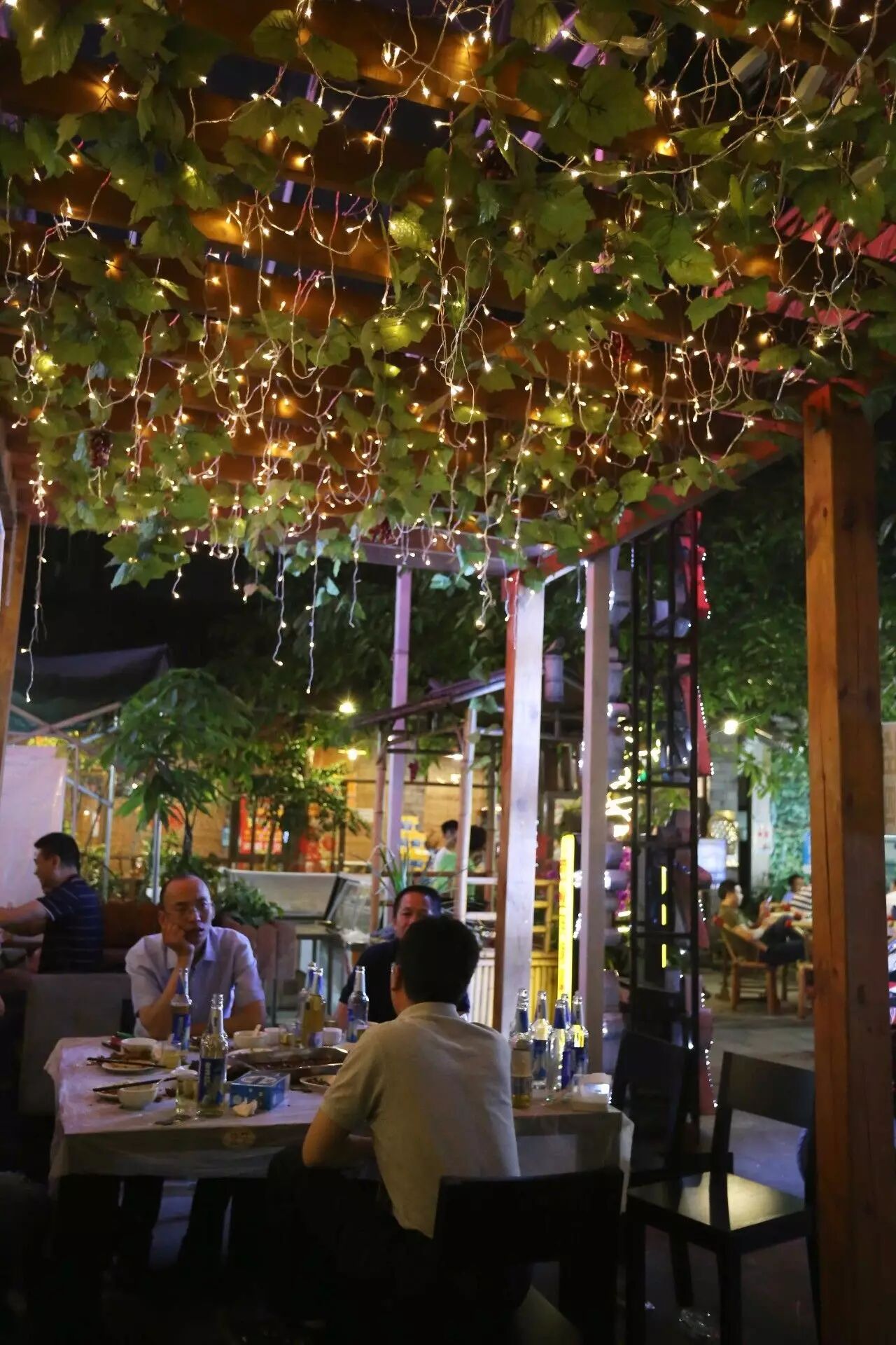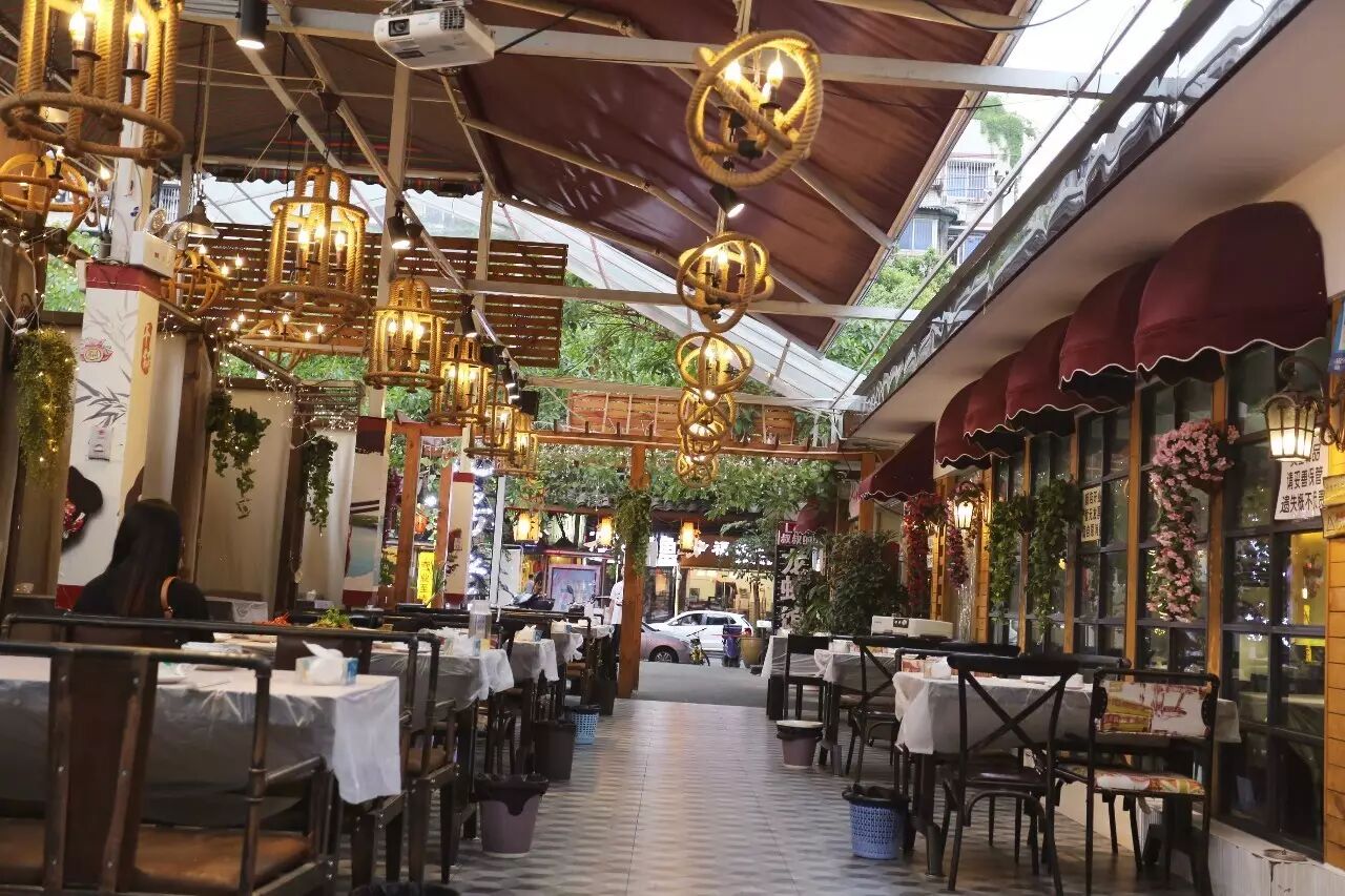 很远就能够看到店面的logo,一走进店,你会瞬间爱上这个院子,龙虾馆的堂子就是包括这个院子和室内的大厅和卡座。绿树成荫的凉意袭来,还有各种吊灯的肆意点缀。夏天的晚上,在这个院坝里头坐到吃龙虾喝啤酒,简直有种回到小时候在院子里乘凉的感觉。