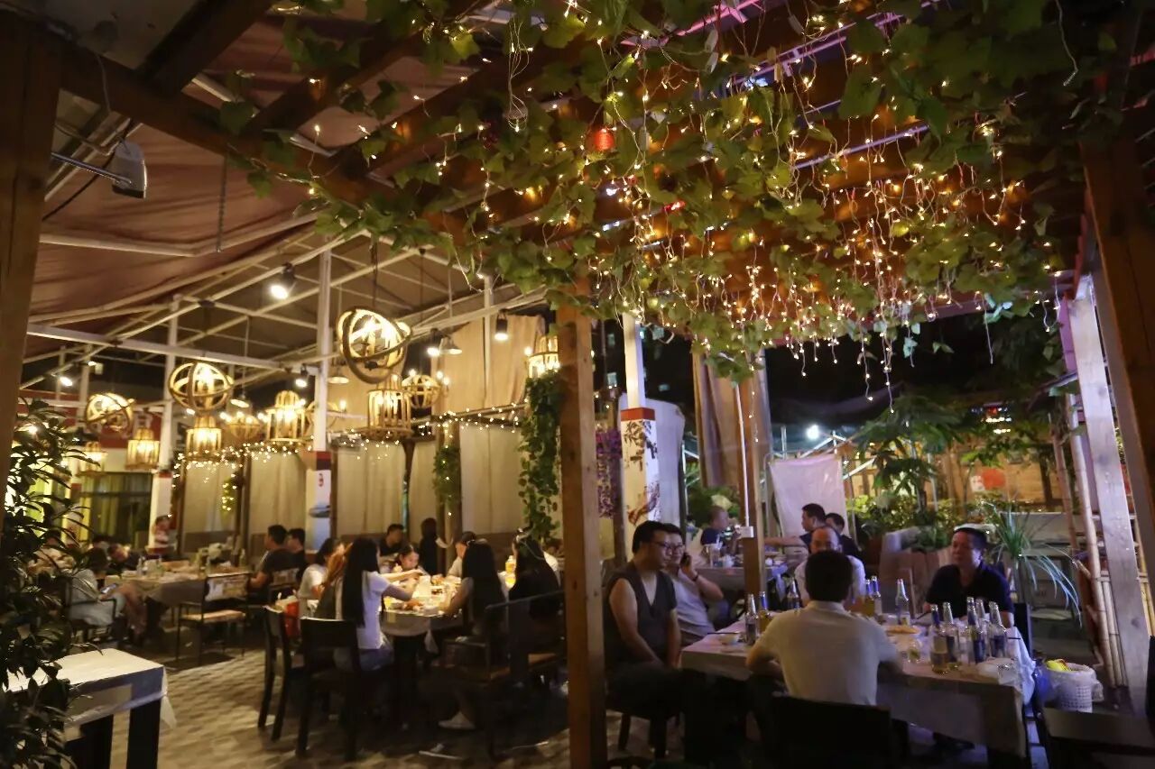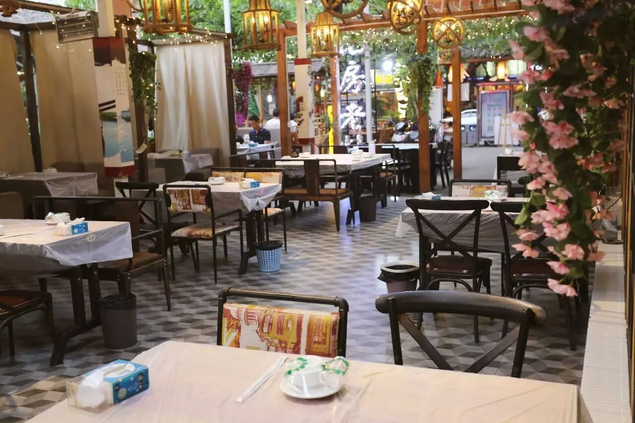 院子里和屋内的大厅也都是干净整洁,每张餐桌摆放的线条感很强,笼罩着整体暖黄色的色调,一眼望过去是那么的温馨惬意。