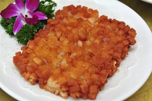 百花萝卜也是一绝。香脆的萝卜粒包裹着打成胶状的虾肉,外表酥脆,内里嫩滑、软糯滋润,也就是这么薄薄的一块,便已回味无穷。鱼肉肉质的紧致再配上萝卜的甜脆,外焦里嫩的甜脆感便立马“脱口而出”。