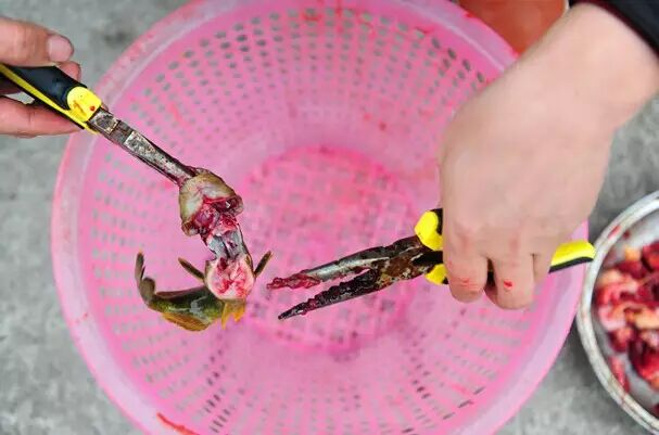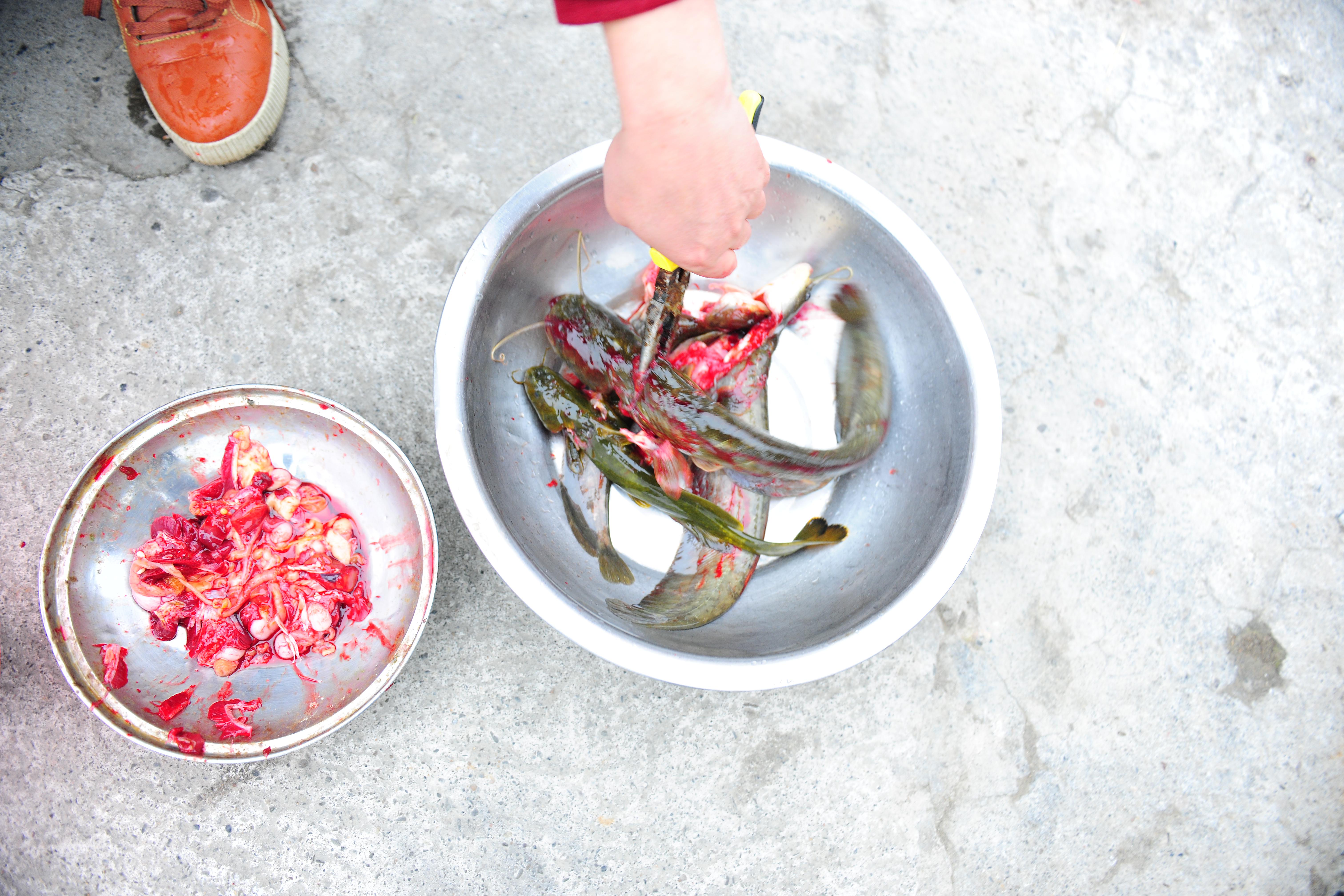 开始剪时,讲究稳准狠,一手拿剪子扣住鱼的上颚,一手用剪子钳住鱼的腰身,双手用力撕开后掏干净里面的杂碎,最后再夹断鱼脊椎,整个杀鱼的过程就完成了。虽然简(粗)单(暴),但用手撕开的鱼肉质会更鲜美、更入味。这也是刘白华家的祖传秘方。