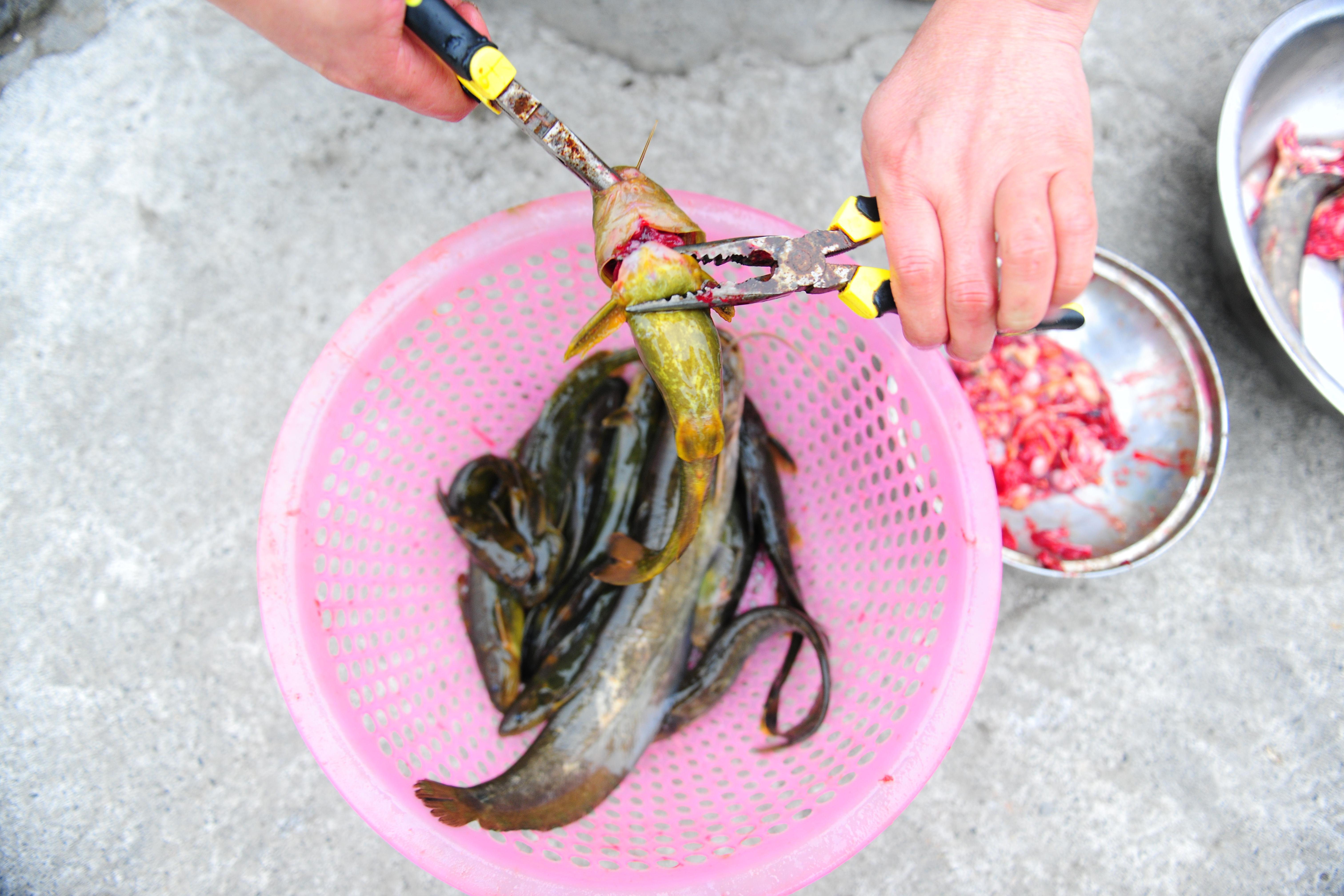 一家叫篢市农家乐的鱼餐馆,在渡口开了25年,大师傅刘白华是家里的第六代捕鱼人。馆子里的鱼全是每天清早出河捞上来的新鲜货。客人来了称鱼也不是捞出来就称,要先用剪刀把鱼给解决了才行,这剪刀也不一般,它是根据师傅的手感专门改造过的专用鱼钳。