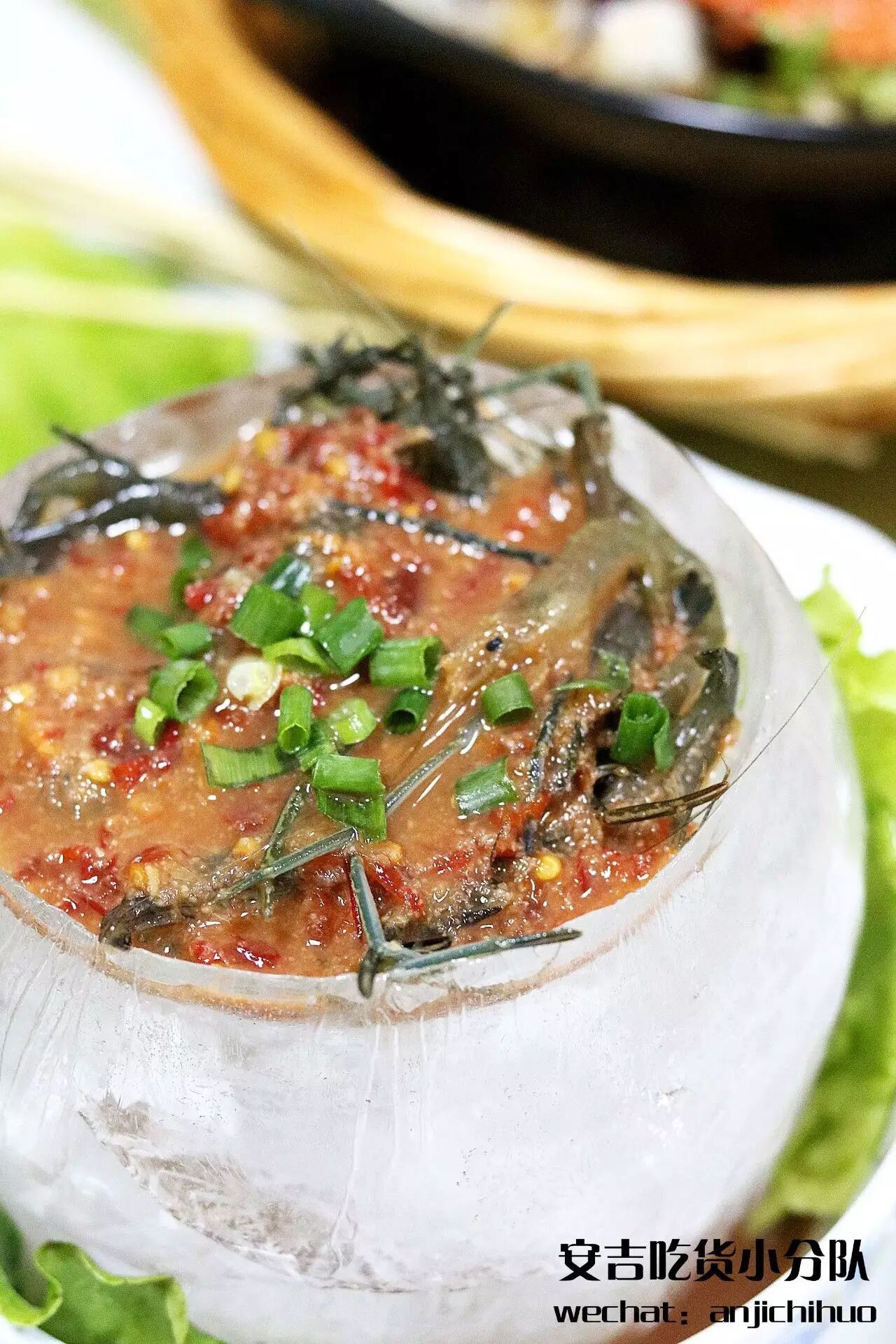 冰镇醉虾的容器足以让人惊叹,将调好料的醉虾放入一个冰球内全方位冰镇,味道更是与外面寻常的醉虾不同,甜辣酸爽的调料让冰镇过的虾肉口感层次更上了一层楼,丝丝清凉剔透,又有甜辣在舌尖窜流。