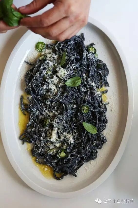 为了让墨鱼汁吃起来更优雅(喏,这个命题我真的不知从何吐槽),不少品牌会直接将墨鱼汁的味道提前混合在面条中,制作成型,再售卖干面条。