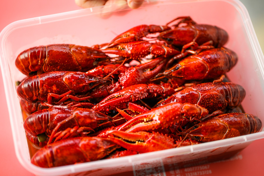 一只只红通通的小龙虾整齐地躺在盒子里,一打开盖子就闻到浓浓的辣椒味,还带着独特的香气。(新鲜下锅的小龙虾尾部一般都是弯曲的,如果死了之后再下锅,那么尾部就是直的。)![]()