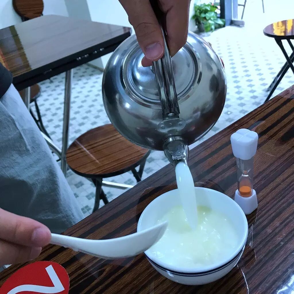 做姜撞奶,说难不难。碗底一勺小黄姜汁,师傅把牛奶烧开再冷却到80度左右(师傅果然有盯着温度计哦),一把小茶壶交给服务生小哥,小哥当着我的面,从高处冲奶进碗里,然后,盖上碟,翻转沙漏,叮嘱不要动它,两分钟就好。