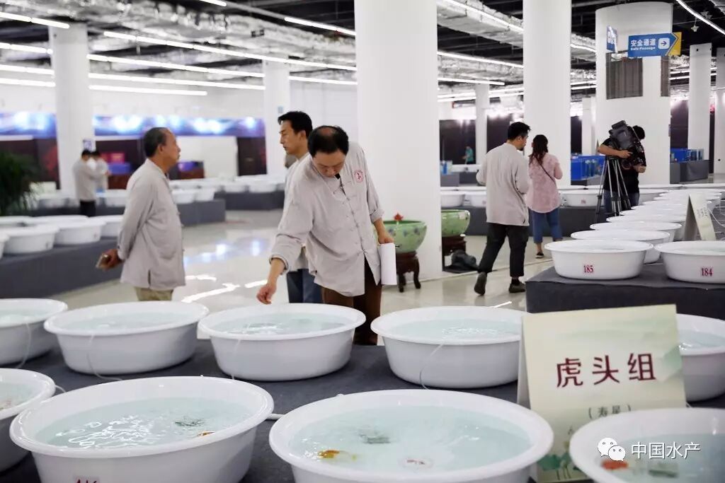 专家评委在为金鱼大赛的参赛金鱼认真评鉴