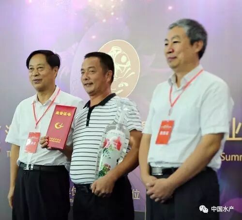 中国渔业协会会长赵兴武、山东省海洋与渔业厅副厅长宋继宝为金鱼大赛全场总冠军获得者张文春颁奖