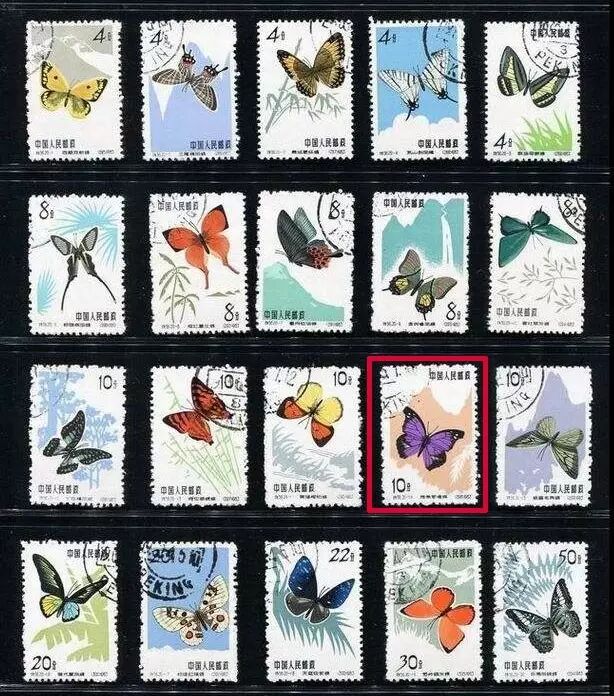 特56《蝴蝶》,20枚邮票显示了20种中国最珍奇的蝴蝶,其中一种,就是“海南紫喙蝶”。